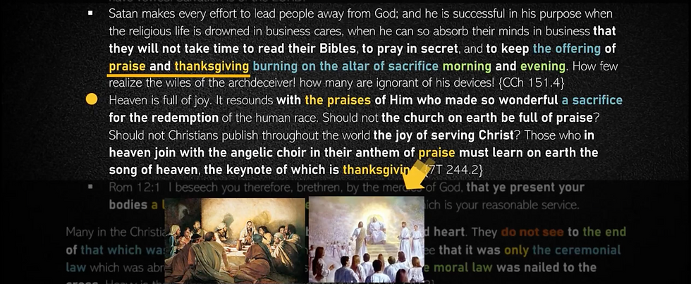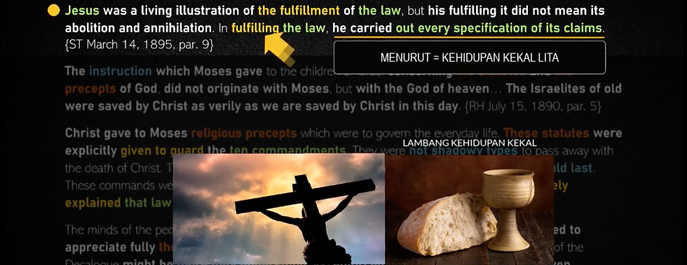 MEAT and DRINK yang diinstitusikan YESUS saat memberikan perjamuan suci pertama pada malam kematianNya, bulan pertama tanggal 14, adalah sama dengan MEMAKAN DARI BUAH KEHIDUPAN; sedang BUAH KEHIDUPAN dari pohon kehidupan sudah ada sejak sebelum dosa, dan adalah buah yang perlu dimakan oleh Adam & Hawa di taman eden; EGW KATAKAN "THE TREE OF LIFE" ADALAH BAYANG2 (ini sudah ada sebelum ada dosa), dari SUBSTANSI yaitu LIFE dan IMMORTALITY (dari one great Source, BAPA), yang sekarang dibawakan kepada kita melalui YESUS KRISTUS!