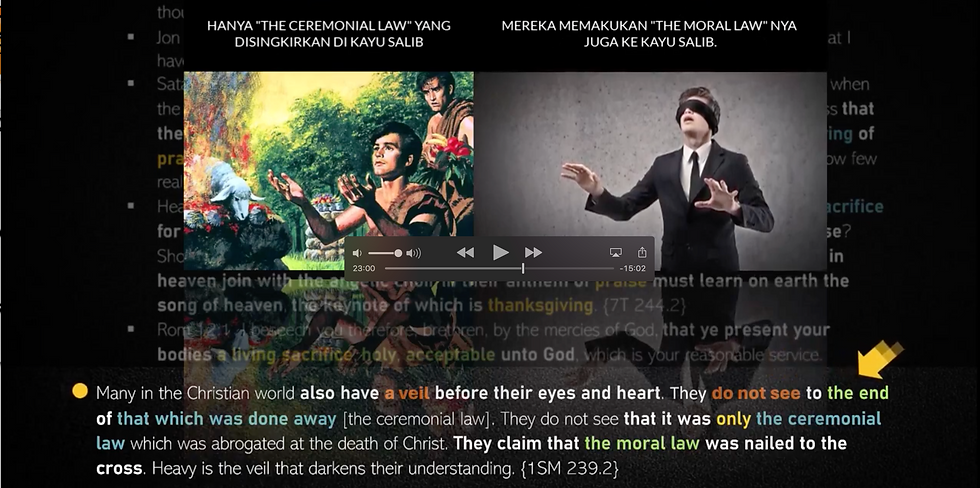 Mereka tidak dapat melihat sampai kepada akhir apa yang telah tidak ada lagi. Mereka tidak melihat bahwa HANYALAH hukum upacara yang telah DITIADAKAN oleh kematian KRISTUS. Mereka menegaskan Hukum Moral sudah dipakukan di salib! Tabir (kerudung) yang menggelapi pengertian mereka berat adanya!